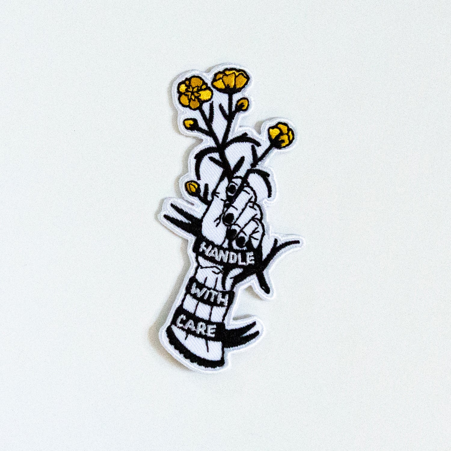 “HANDLE WITH CARE” embroidered patch with iron-on backing