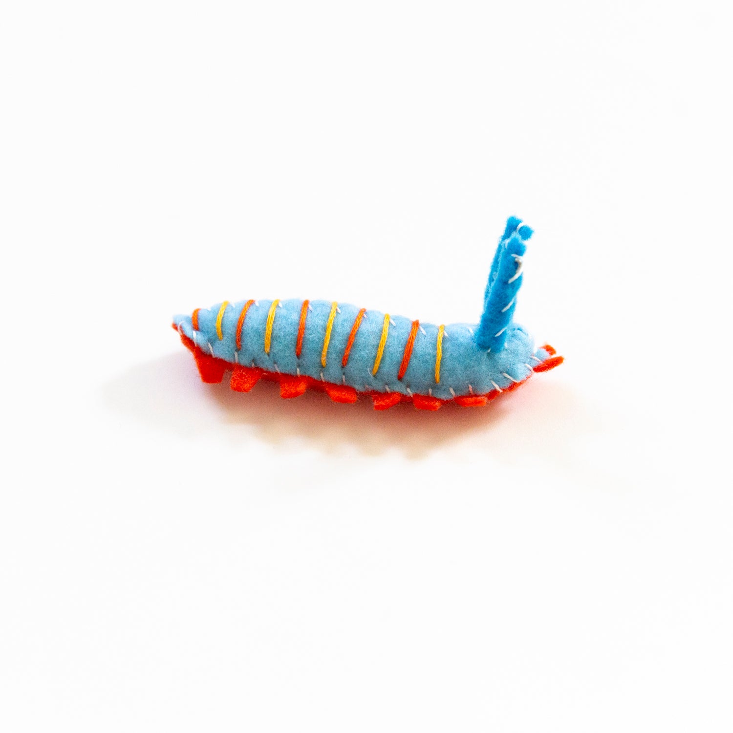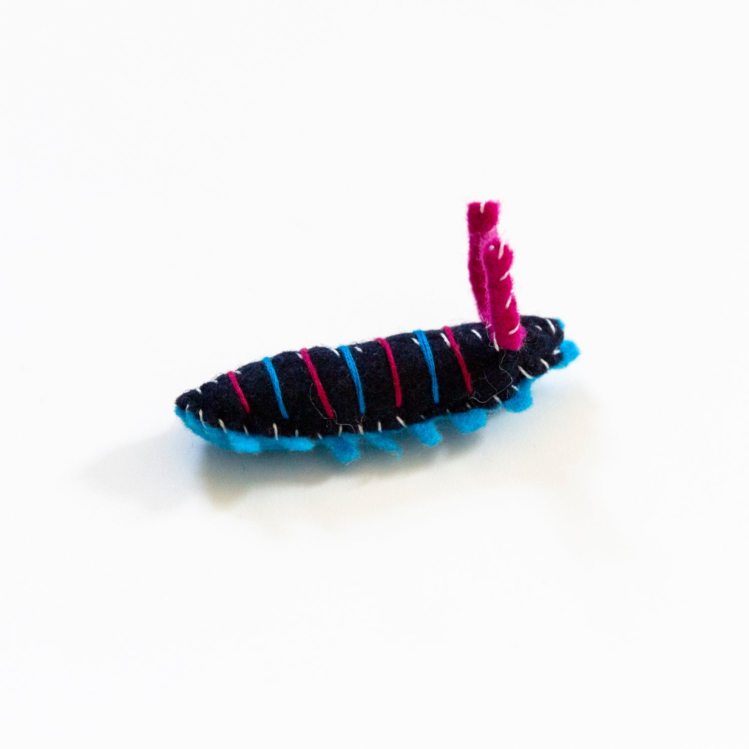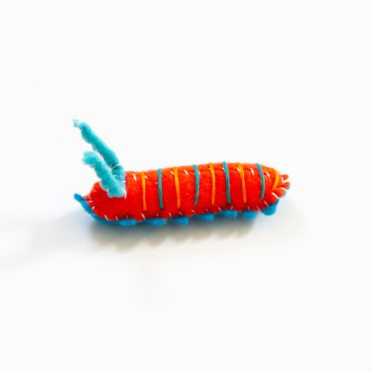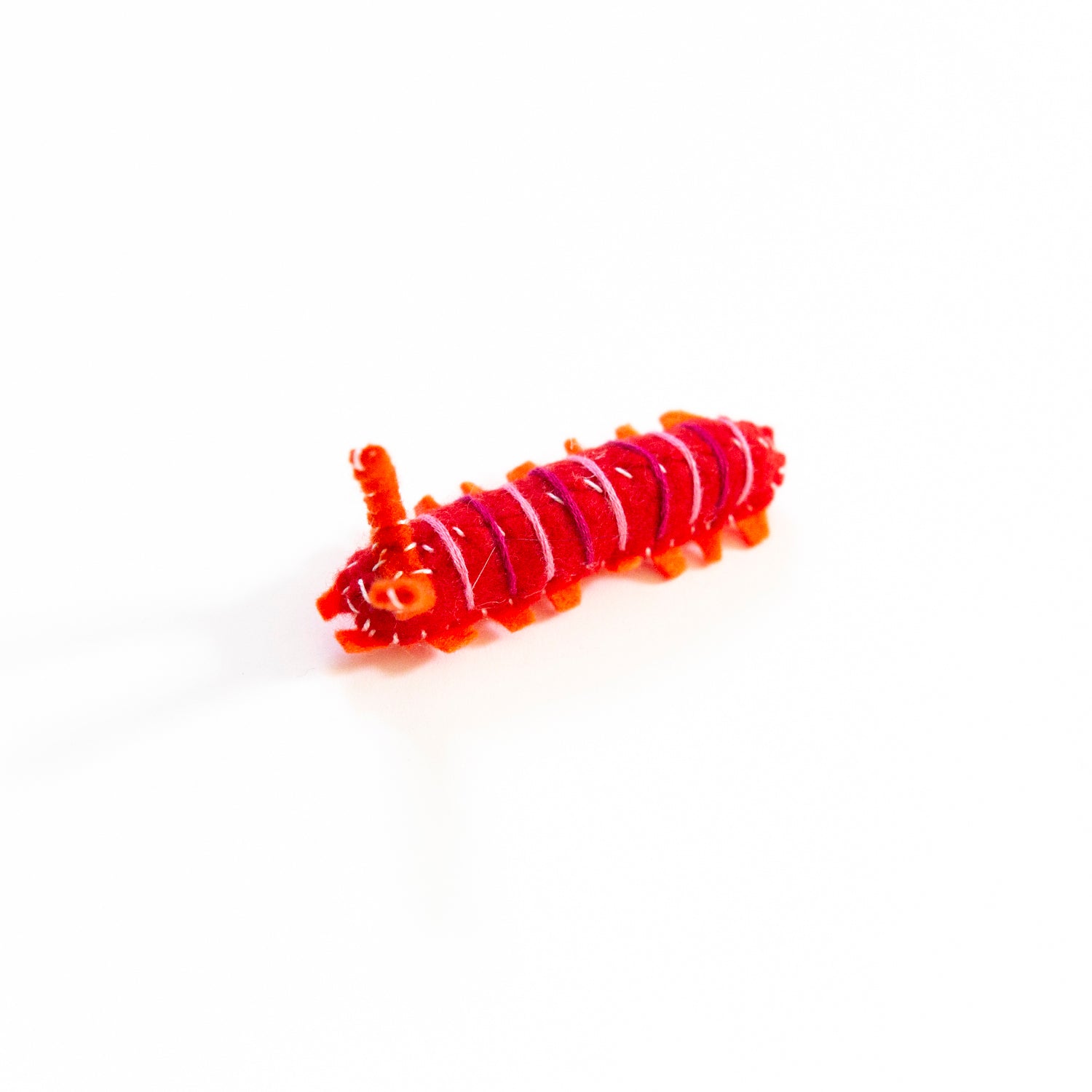 Hand sewn felt garden caterpillar made from recycled vegan felt with bendable wire inside antenna to help maintain shape/posture
