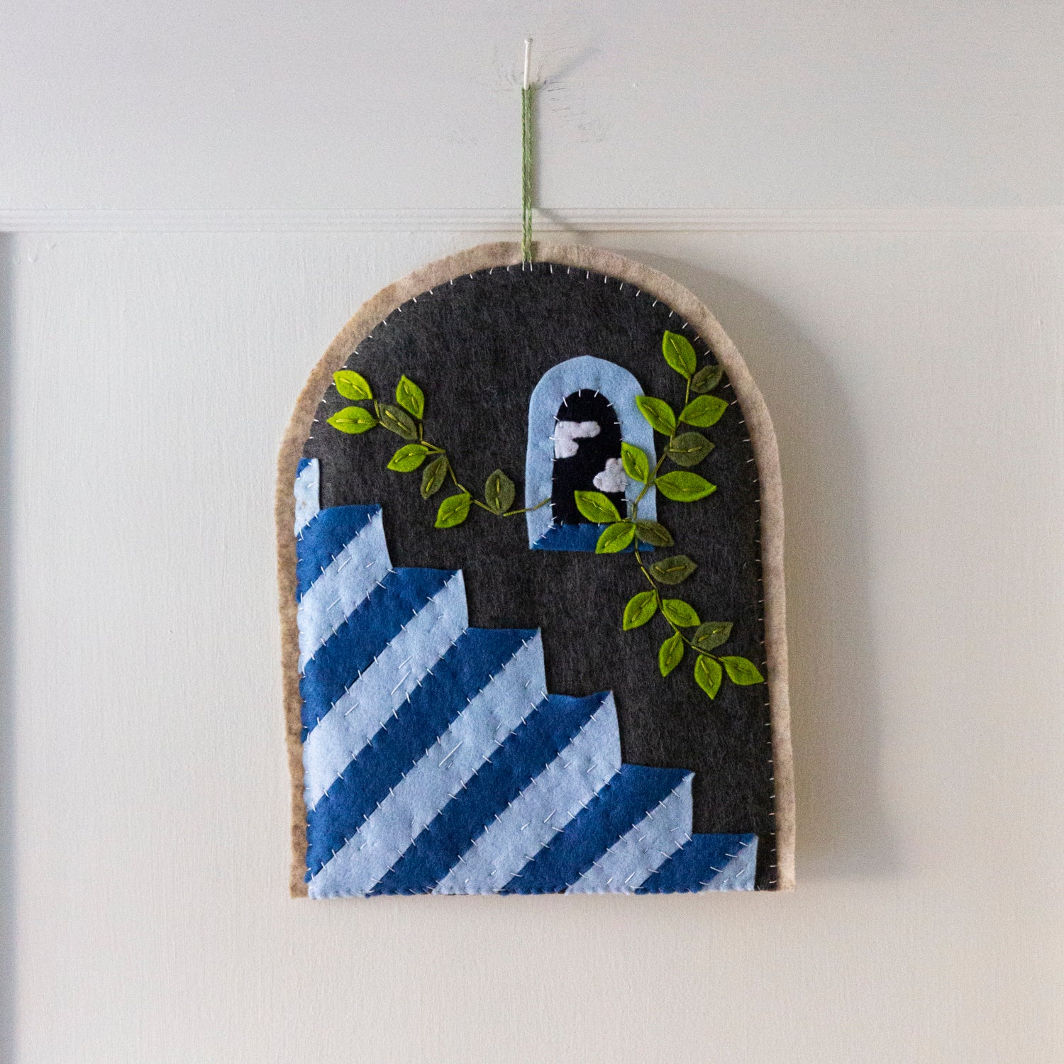 2D felt wall stairs! One-of-a-kind wall art piece is hand sewn and embroidered and measure at about 10 x 12 inches tall and has a loop on top for hanging on the wall and cardboard inside to maintain shape.