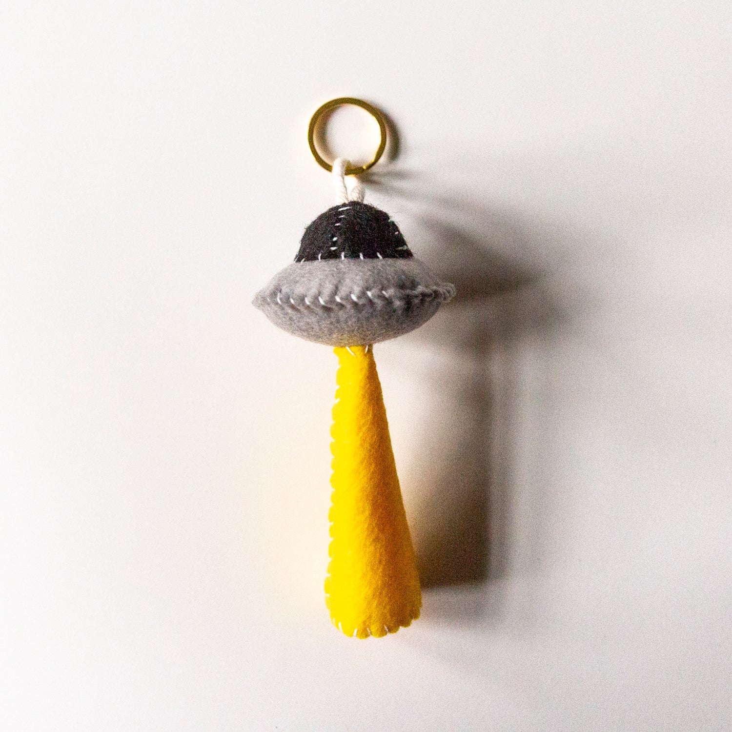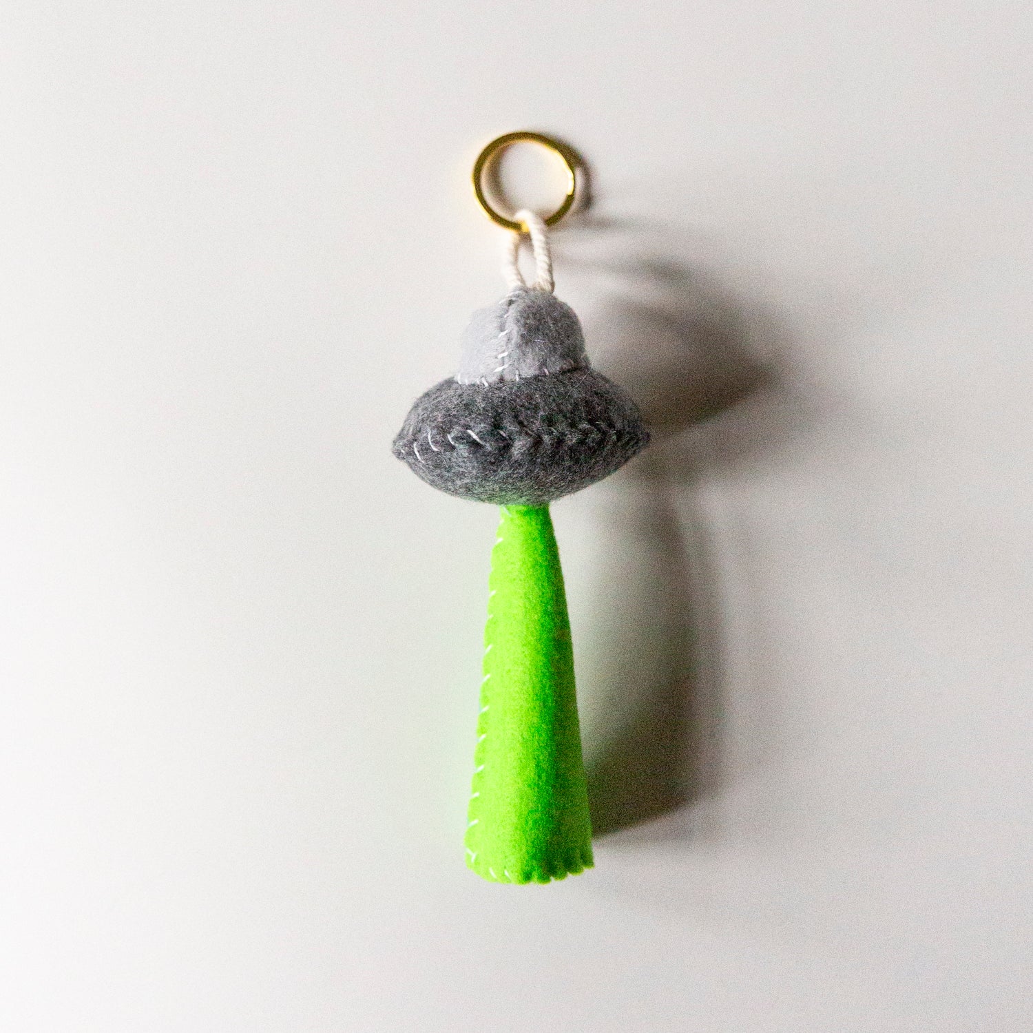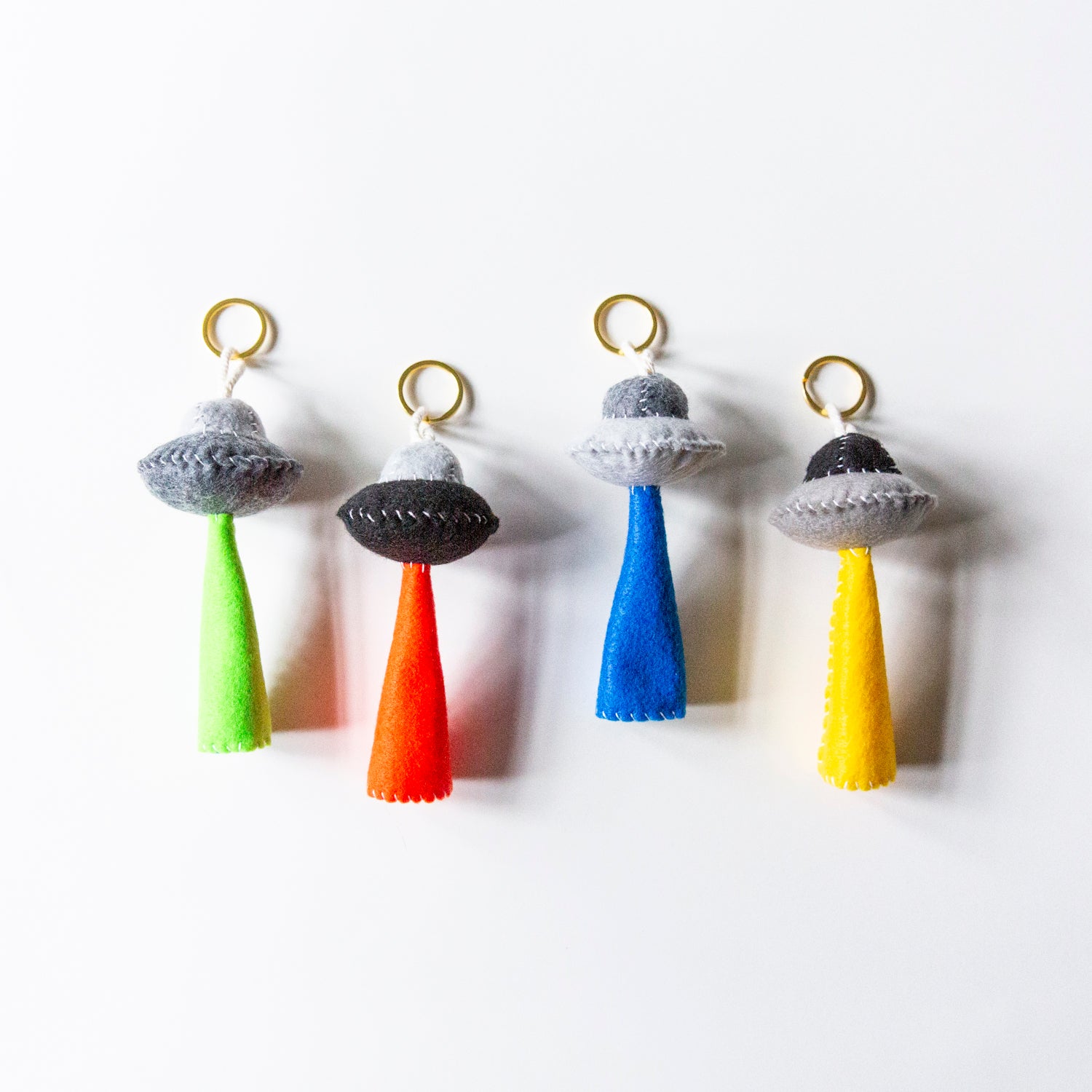Handmade felt UFO charms/keychains made with metal keychain ring, cotton cord, fluff filling and vegan felt.