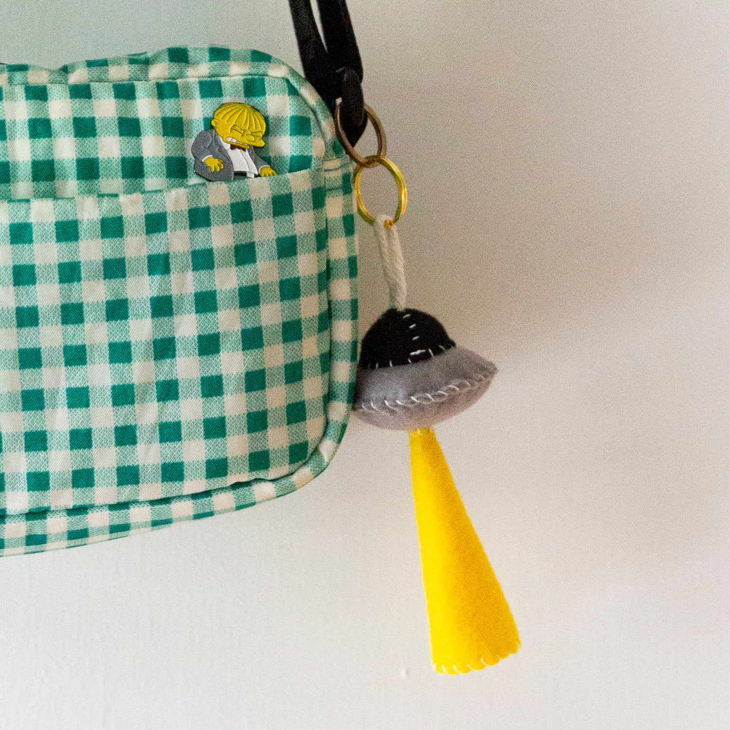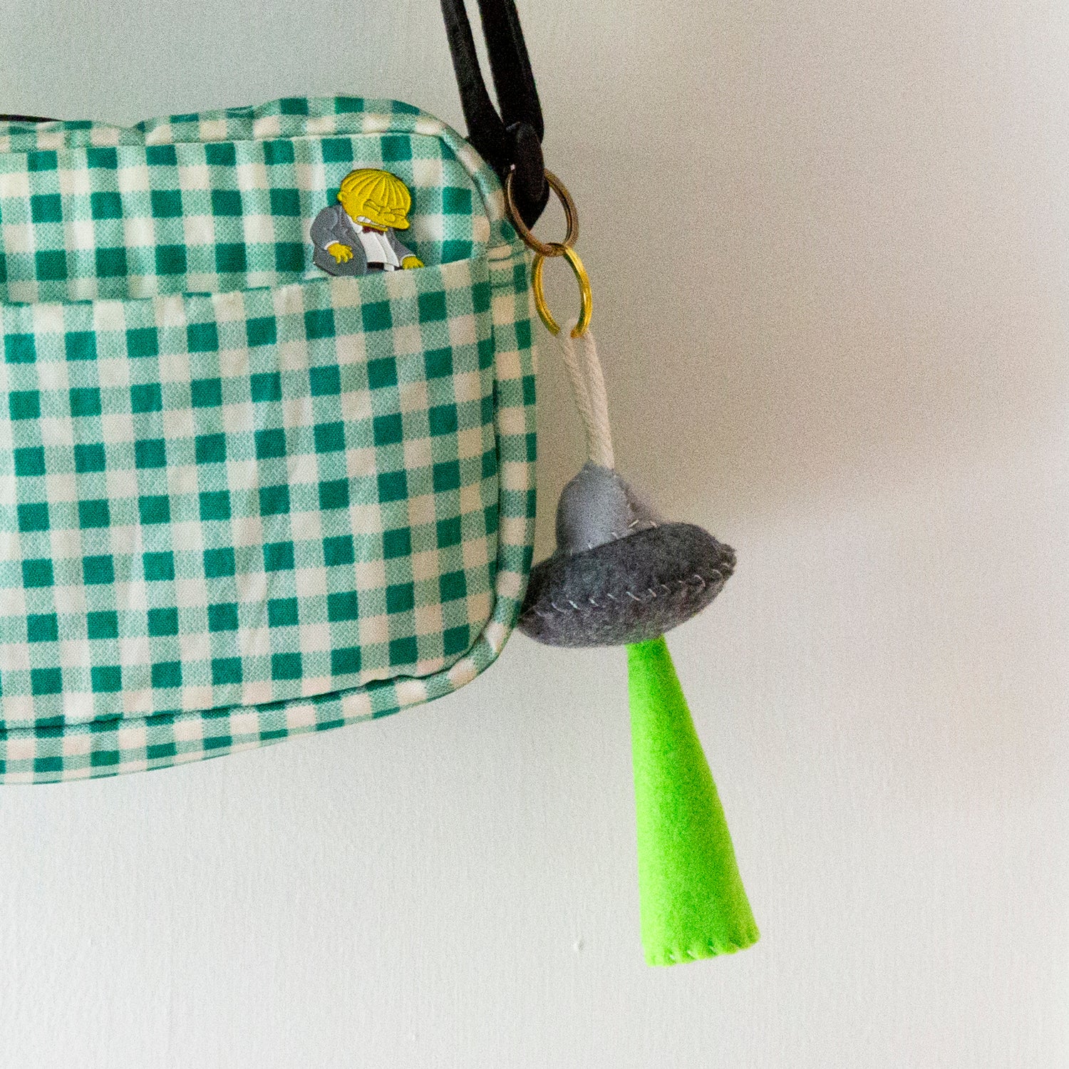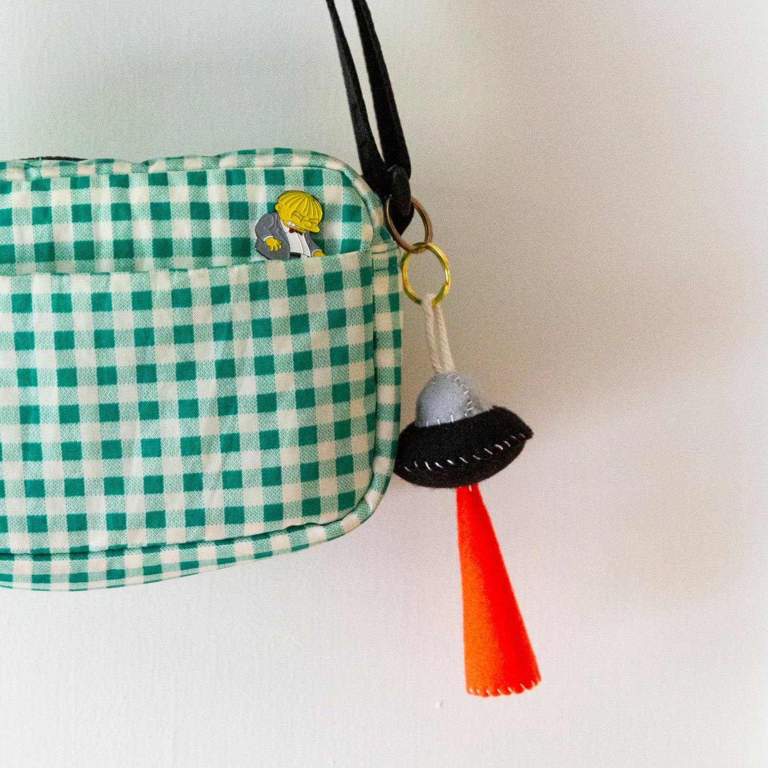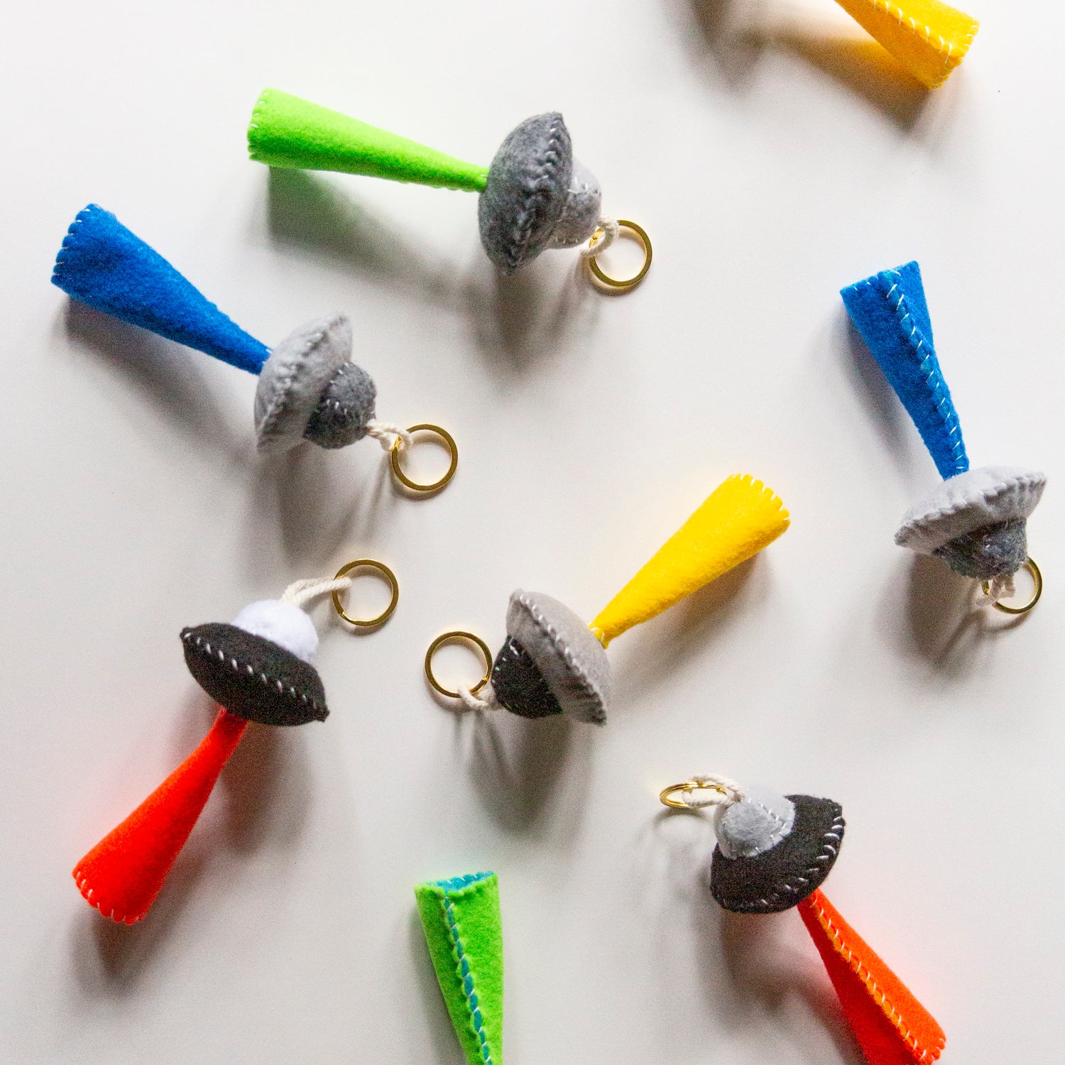 Handmade felt UFO charms/keychains made with metal keychain ring, cotton cord, fluff filling and vegan felt.