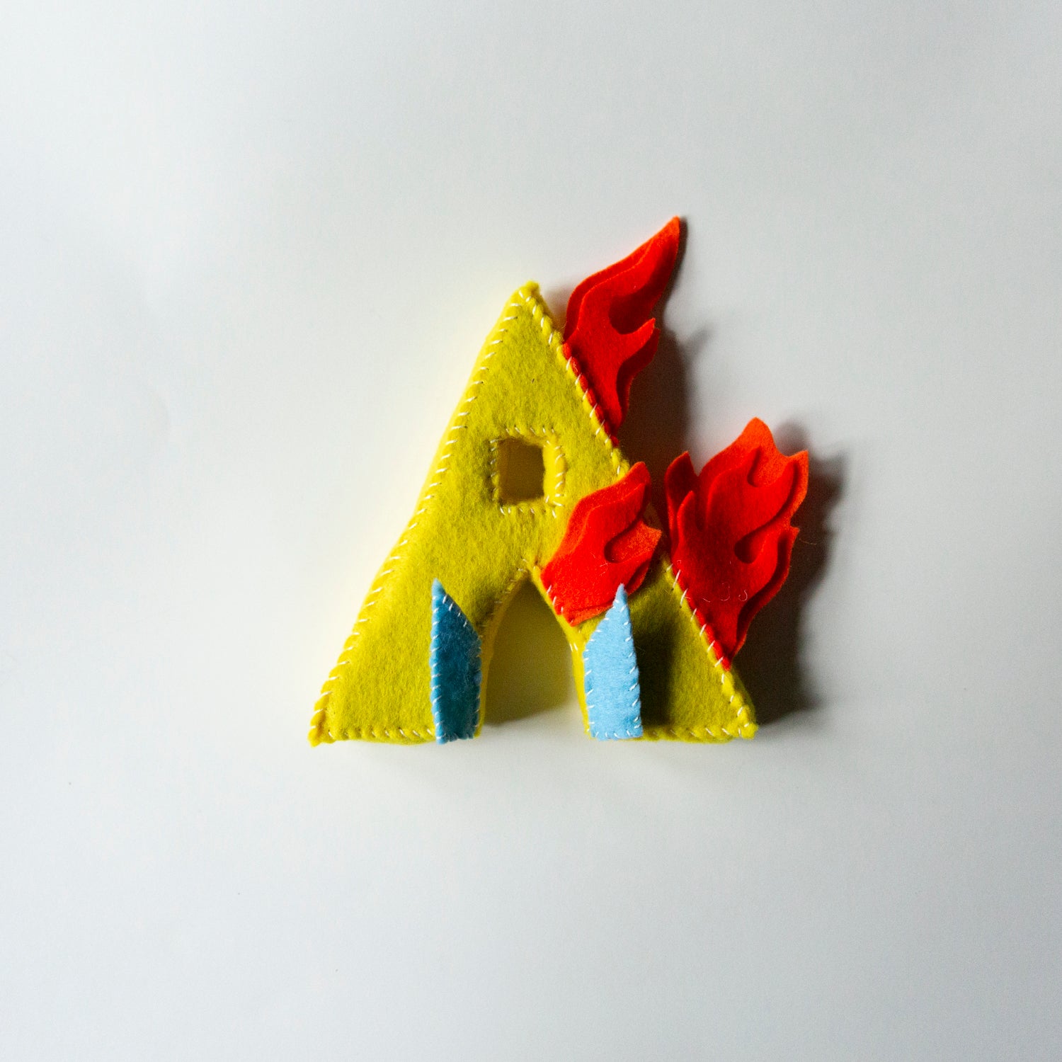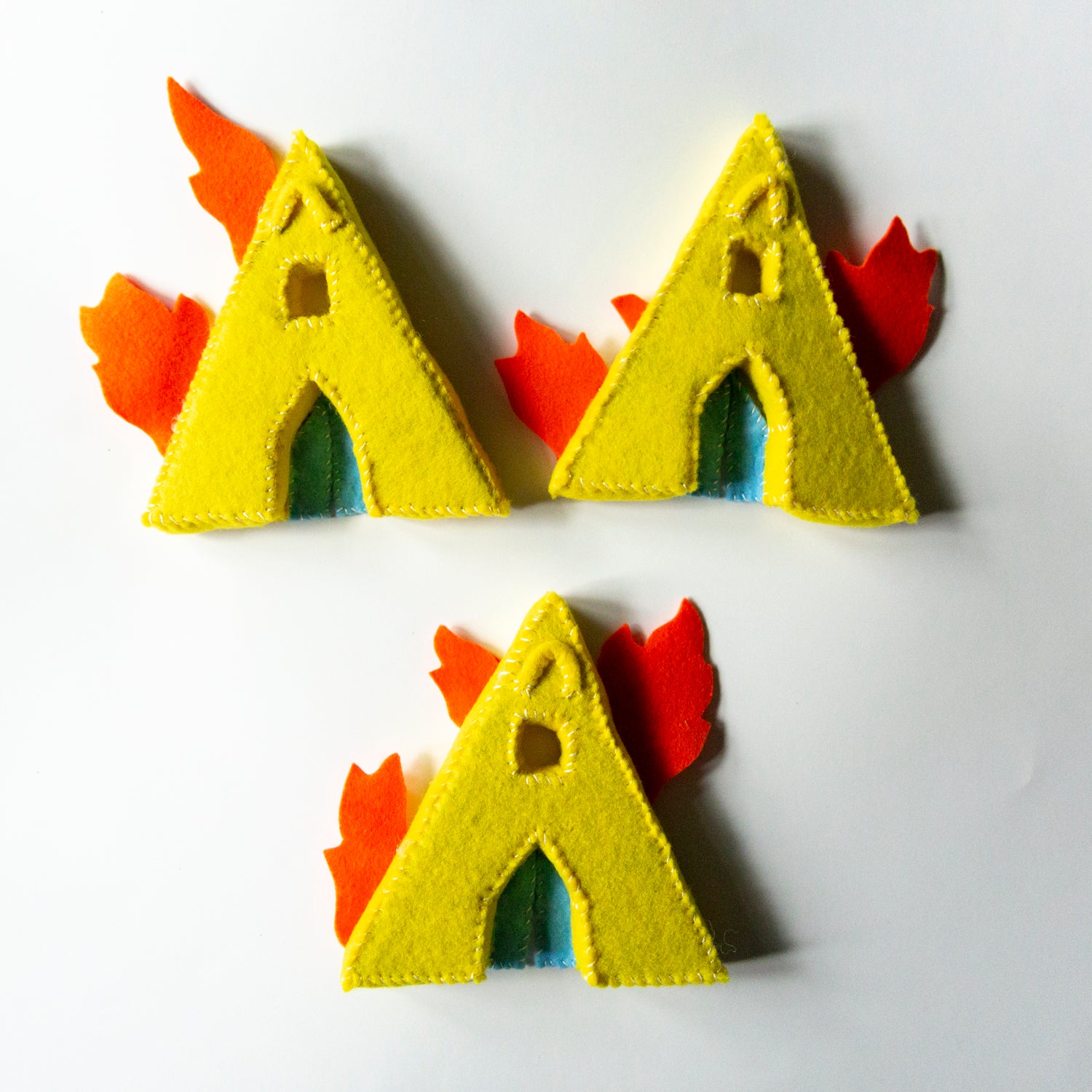 Hand sewn one-of-a-kind felt burning yellow temples from a certain movie with window cutout and doors that can be opened or closed.