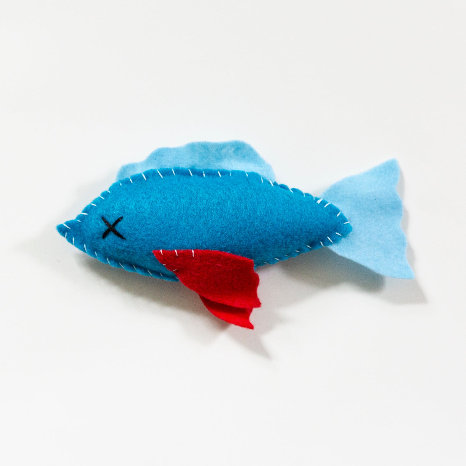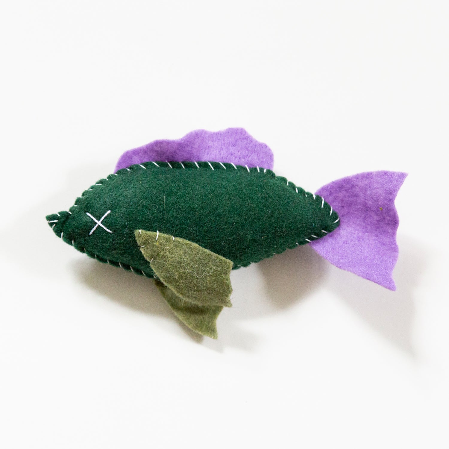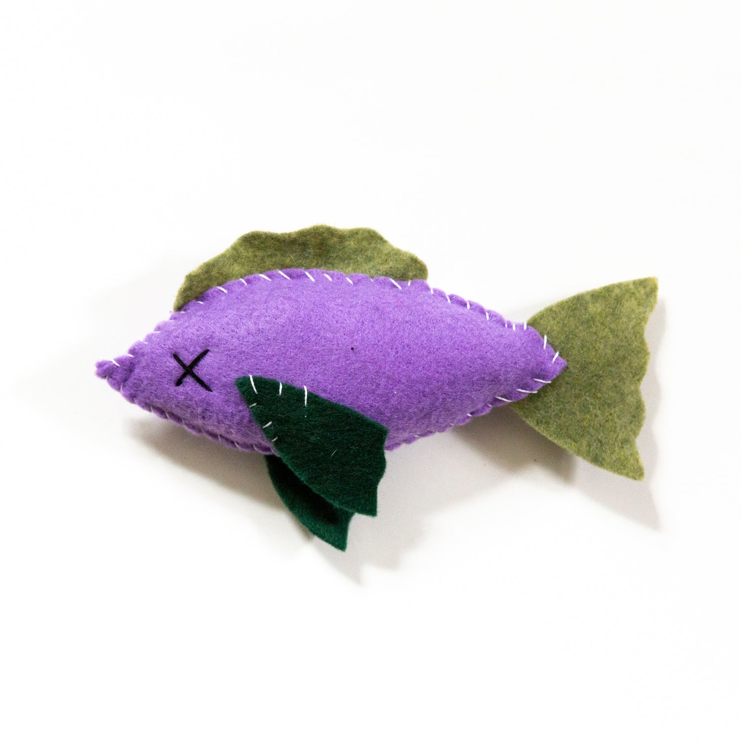 Handmade felt big dead fish kicker cat toy with organic home-grown catnip and fluff filling. Each piece measures about 3x7in and is made from vegan felt.