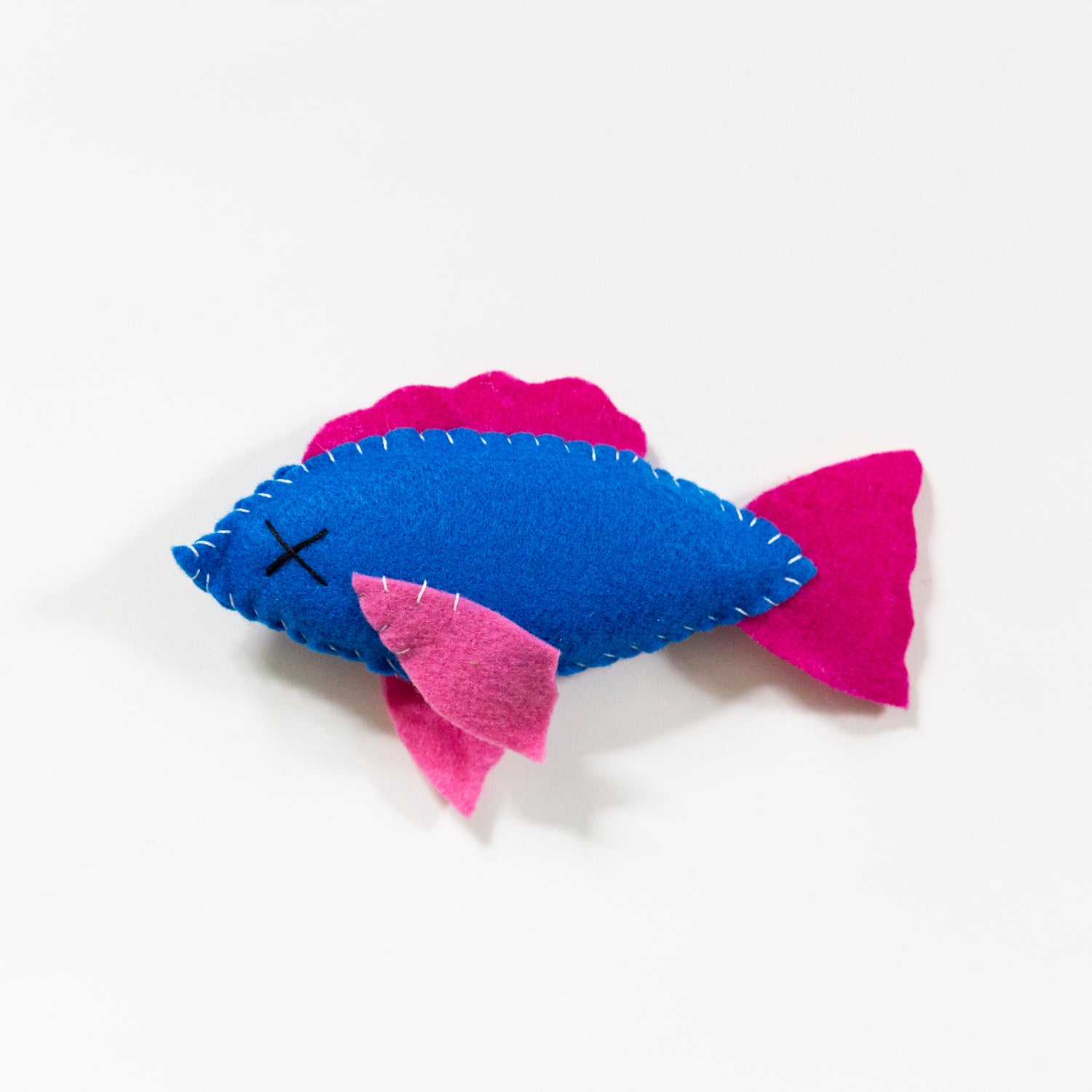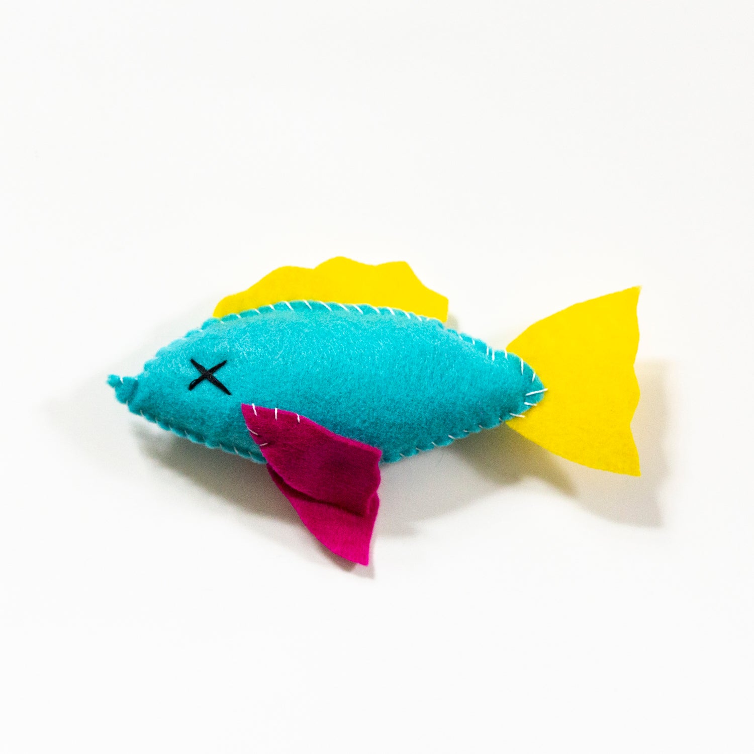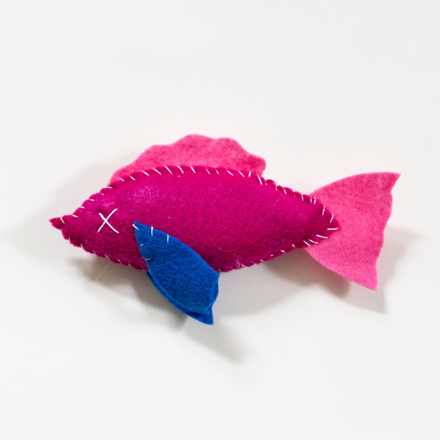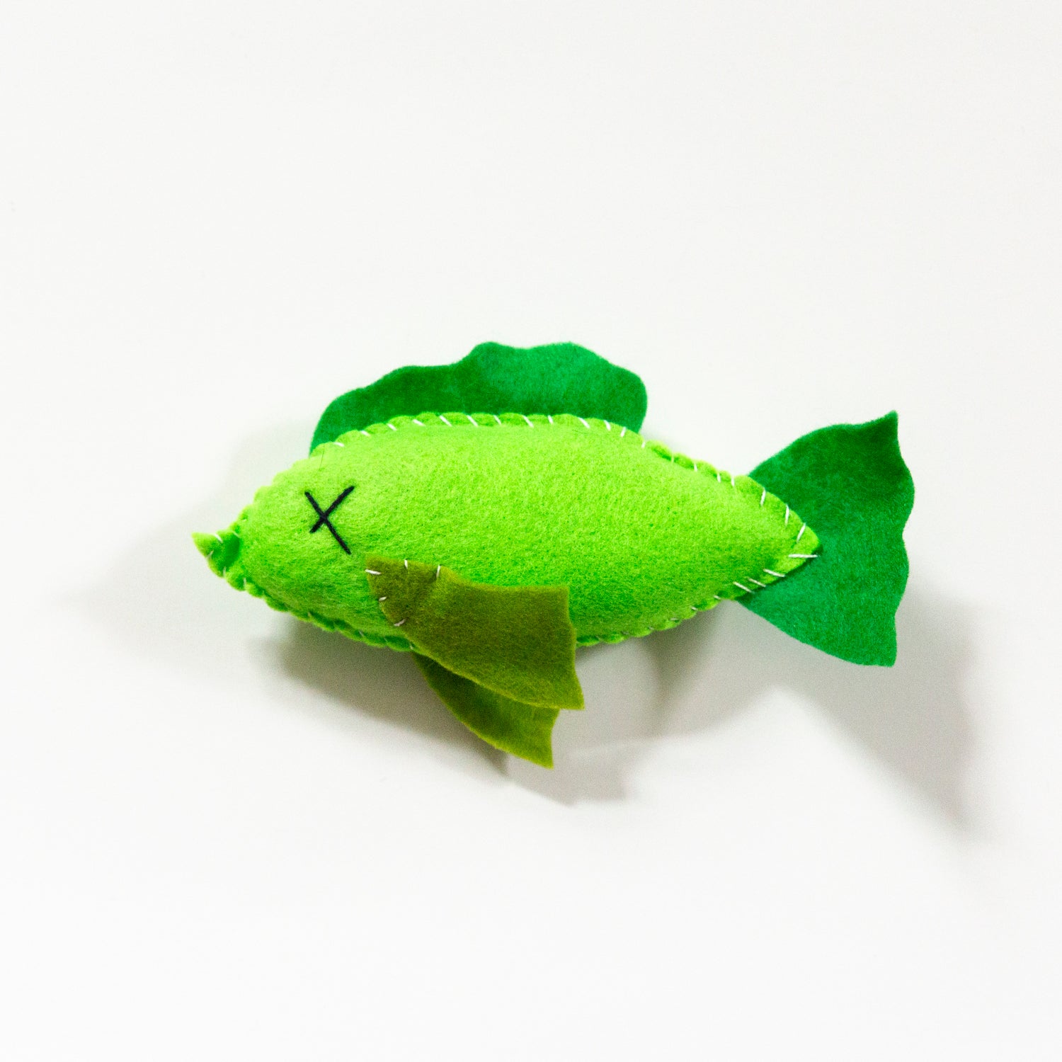 Handmade felt big dead fish kicker cat toy with organic home-grown catnip and fluff filling. Each piece measures about 3x7in and is made from vegan felt.